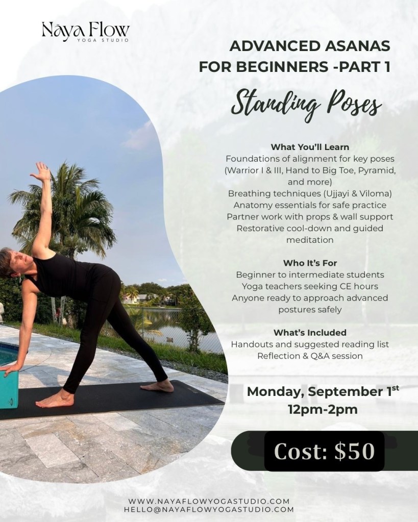 Join us Sunday, Nov 2 | 12–2 PM for a deep dive into: Continuing our yoga journey with Externally Rotated Standing Poses, Yoga history & philosophy, and Breathwork (Pranayama). Earn 2 YA CE credits and elevate both your practice and teaching! Reserve your spot now to access your early bird discount rate of $44 by October 25th. After that is $50. Got to www.nayaflowyogastudio.com/home.